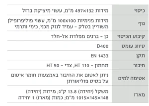 סיווג עומס D400 לפי תקן EN 1433, מתאים לאזורים עם תנועת משאיות וכלי רכב כבדים.